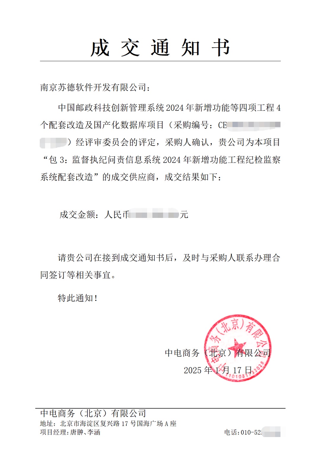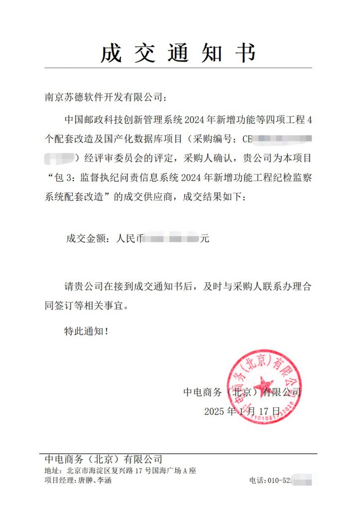 南京苏德软件开发有限公司中标中国邮政监督执纪问责信息系统改造项目