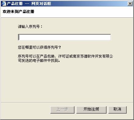 如果您的计算机(安装有本系统)可以连接到互联网(即可以访问www.sudesoft.cn网站),选择菜单“注册”,出现下图,输入序列号,单击【开始注册】按钮。计算机自动连上互联网注册服务器并注册本系统。